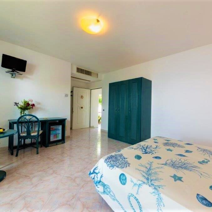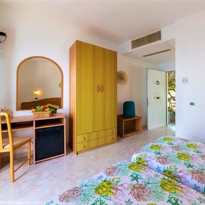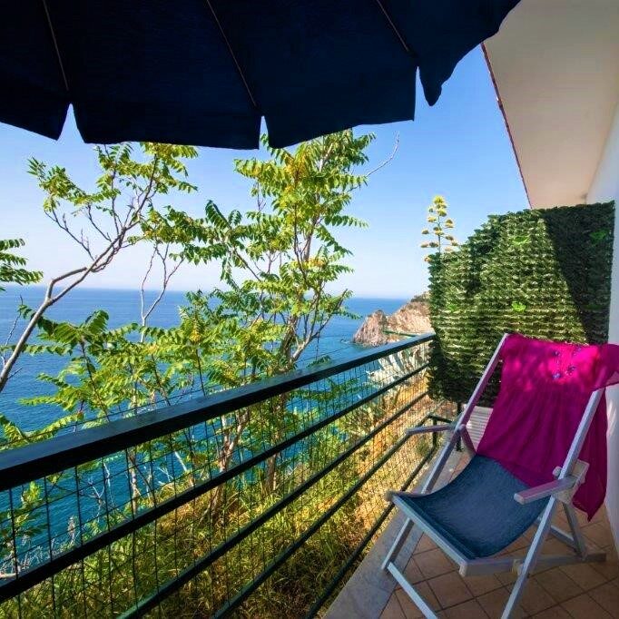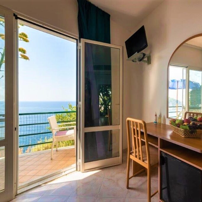Each room, whether standard or with sea view, always has a deck chair/sun lounger with umbrella and a small table with outdoor chairs available for everyone.