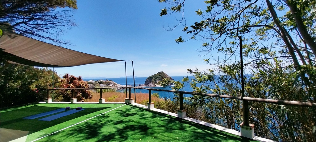 La piattaforma yoga è disponibile su prenotazione e può ospitare fino ad un massimo di 18 persone. La vista panoramica sul mare e Sant'Angelo, l'inebriante profumo del rosmarino e della menta, la quiete del Paese di Succhivo che con i suoi ritmi lenti scandisce la pace che ci circonda, il profumo del rosmarino e della menta ed il cinguettio degli uccelli, renderanno il tuo prossimo ritiro senz'altro unico ed accattivante.